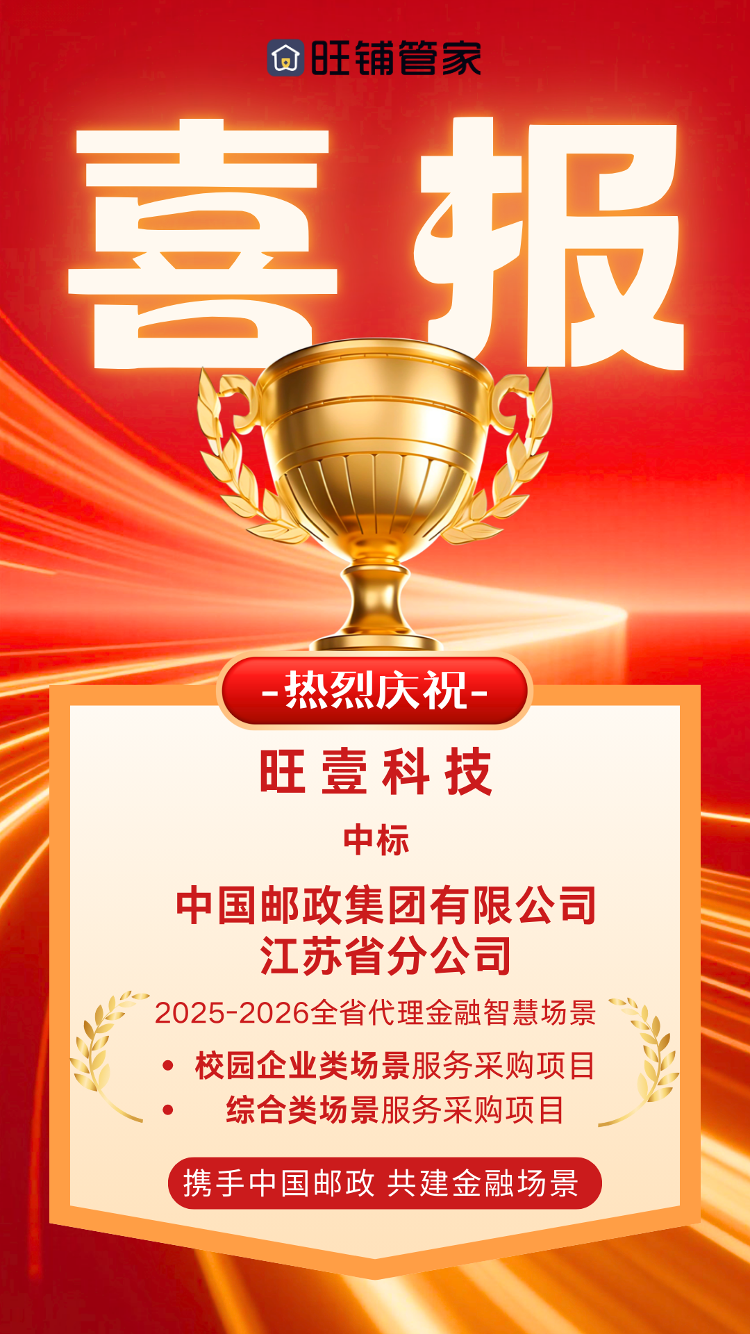 近日,旺壹科技在中国邮政集团有限公司江苏省分公司场景服务项目的公开招标中,凭借其在金融智慧场景领域的领先技术与成熟解决方案,在多家竞标单位中脱颖而出,成功中标校园企业类与综合类场景服务项目。
