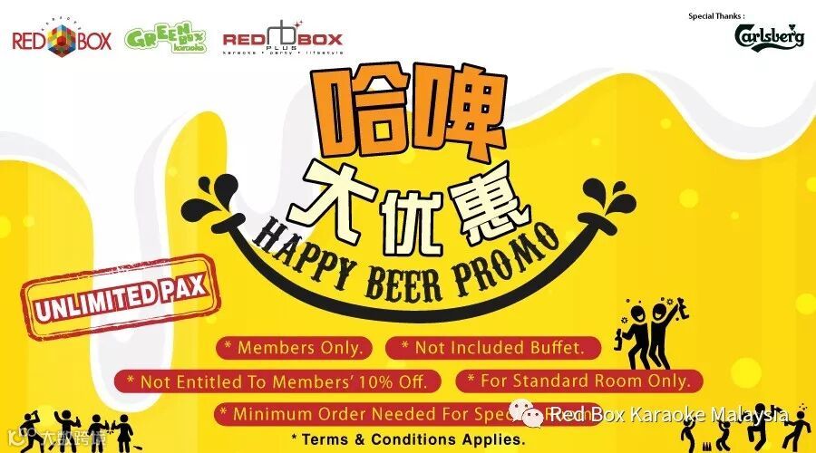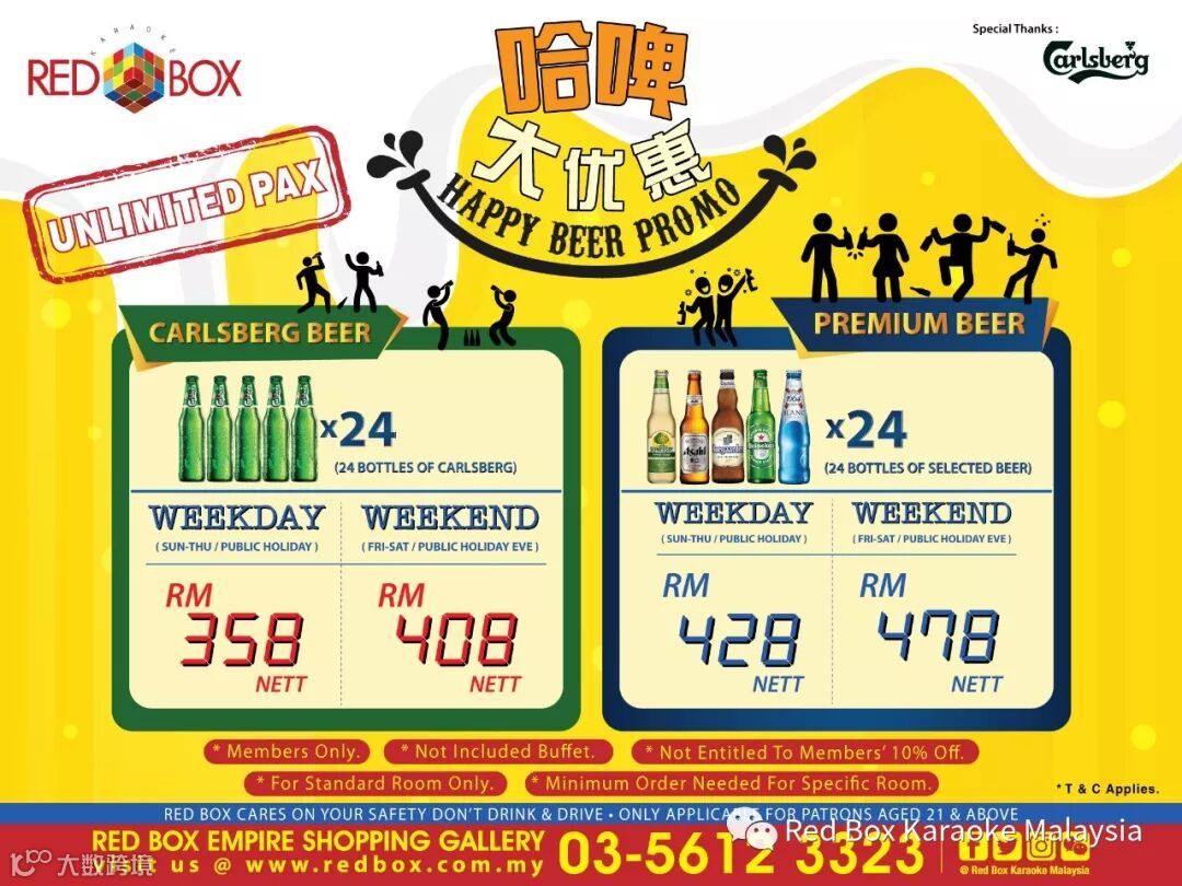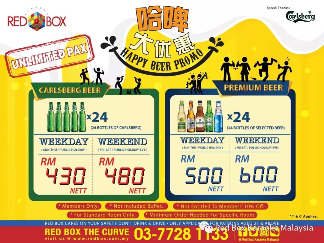 啤酒kaki们,喝酒狂欢时刻到啦!放工之后想要和一班酒鬼朋友或同事唱K喝酒放轻松?那就来 Red Box, Green Box & Red Box PLUS Karaoke 吧!我们的「哈啤大优惠」提供一箱啤酒 (24瓶),让你唱饮到爽啊!