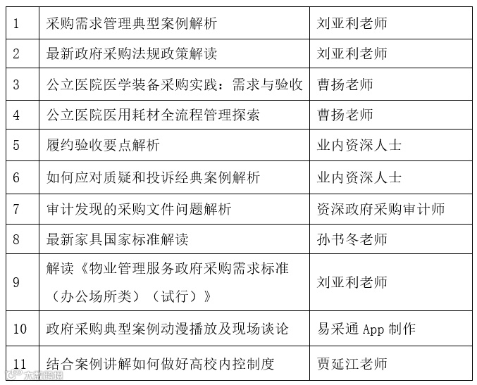 本次培训将为大家解析采购需求管理典型案例;解读最新政府采购法规政策;解析履约验收要点和审计发现的采购文件问题等。由政府采购信息报社社长、高级编辑刘亚利女士携5位老师亲临授课。