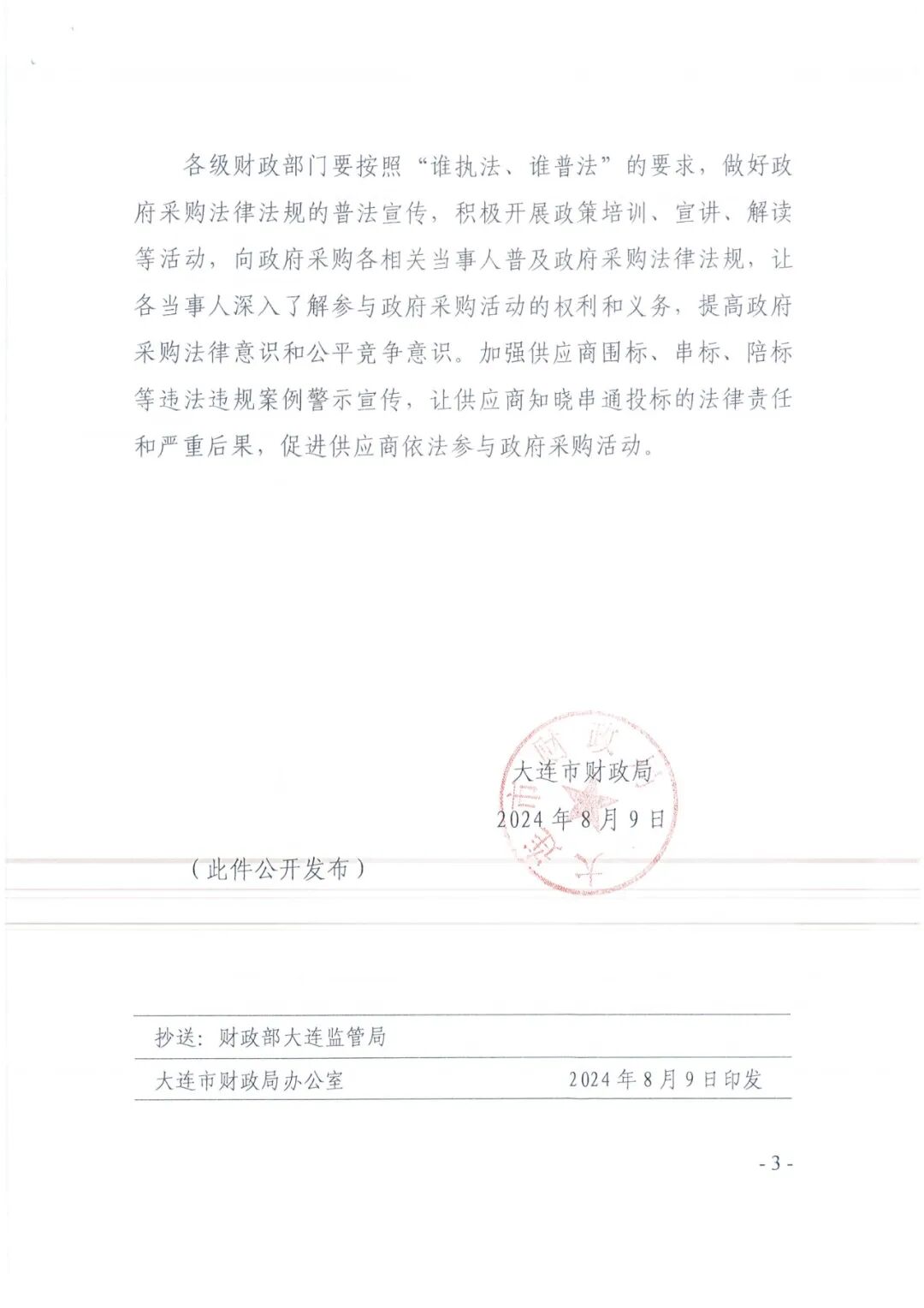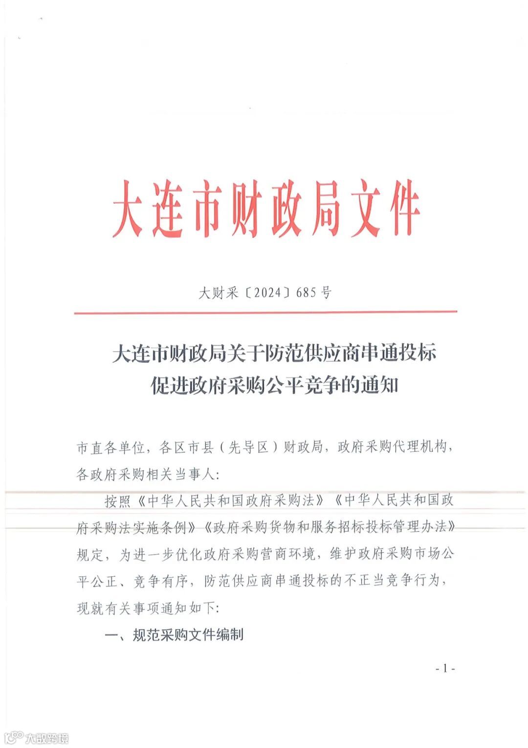 日前,大连市财政局印发了《大连市财政局关于防范供应商串通投标促进政府采购公平竞争的通知》(大财采〔2024〕685号,以下简称《通知》),维护政府采购市场公平公正、竞争有序,防范供应商串通投标的不正当行为。