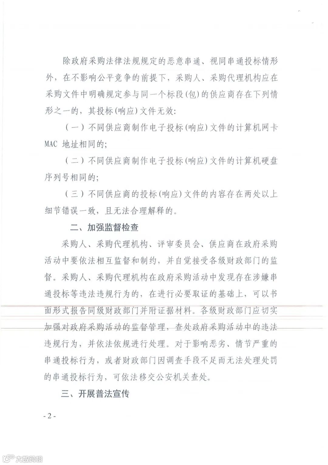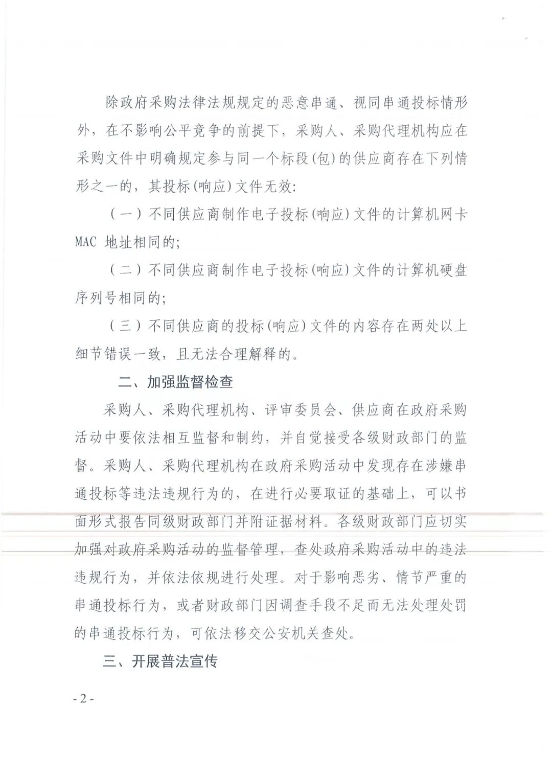 《通知》明确,除政府采购法律法规规定的恶意串通、视同串通投标情形外,在不影响公平竞争的前提下,采购人、采购代理机构应在采购文件中明确规定参与同一个标段(包)的供应商存在下列情形之一的,其投标(响应)文件无效:(一)不同供应商制作电子投标(响应)文件的计算机网卡MAC地址相同的;(二)不同供应商制作电子投标(响应)文件的计算机硬盘序列号相同的;(三)不同供应商的投标(响应)文件的内容存在两处以上细节错误一致,且无法合理解释的。