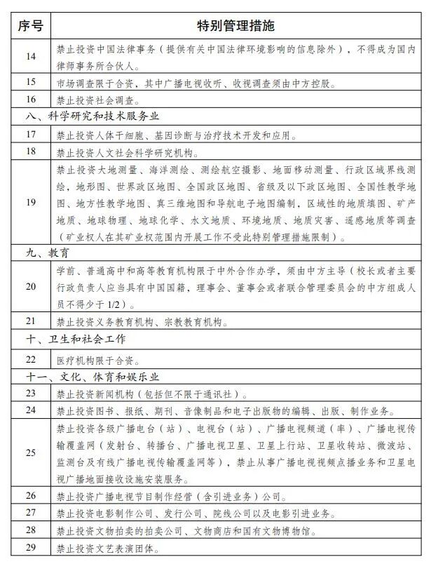 一、《外商投资准入特别管理措施(负面清单)》(以下简称《外商投资准入负面清单》)统一列出股权要求、高管要求等外商投资准入方面的特别管理措施。《外商投资准入负面清单》之外的领域,按照内外资一致原则实施管理。境内外投资者统一适用《市场准入负面清单》的有关规定。