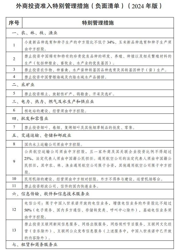 外商投资准入特别管理措施(负面清单)(2024年版)说明