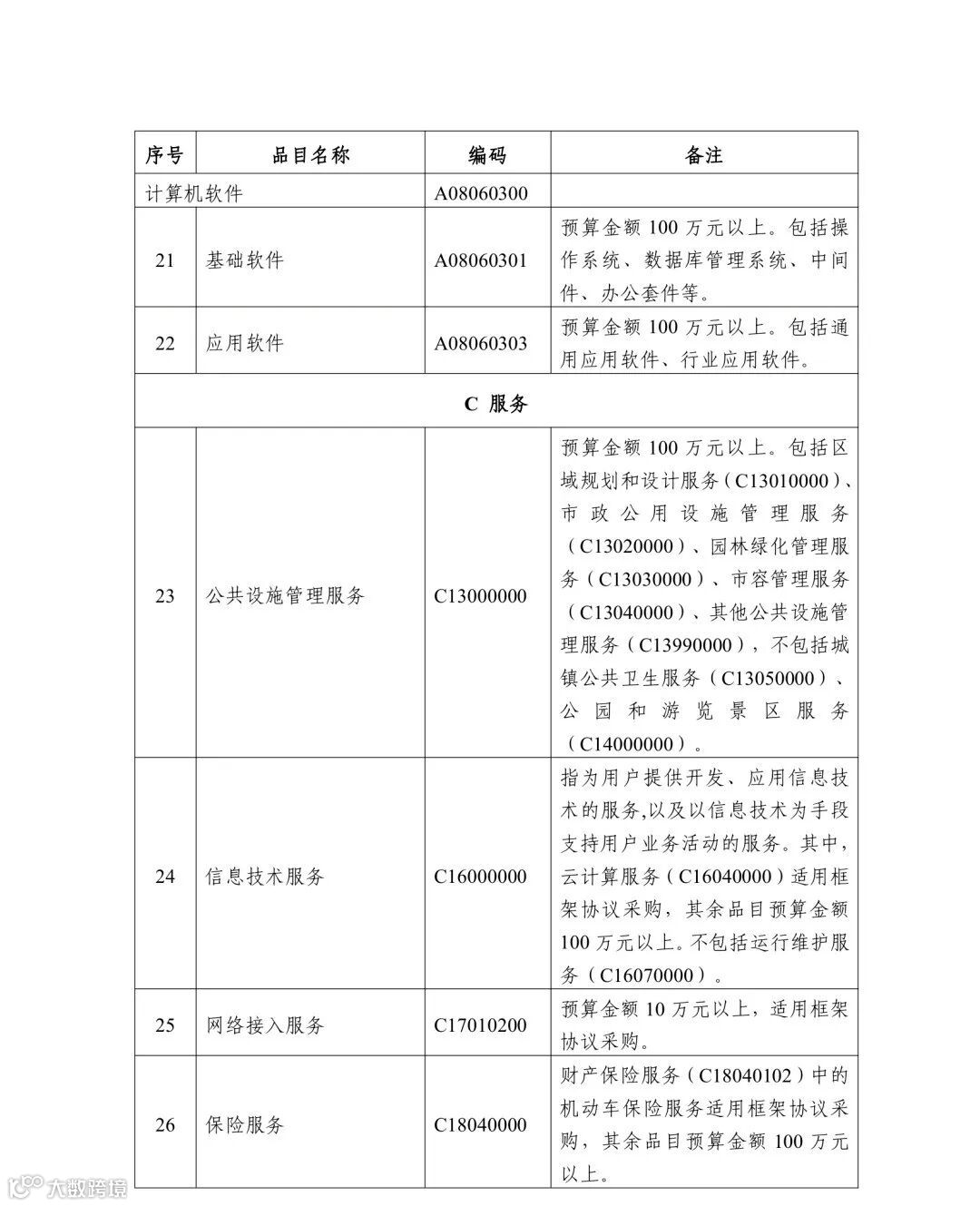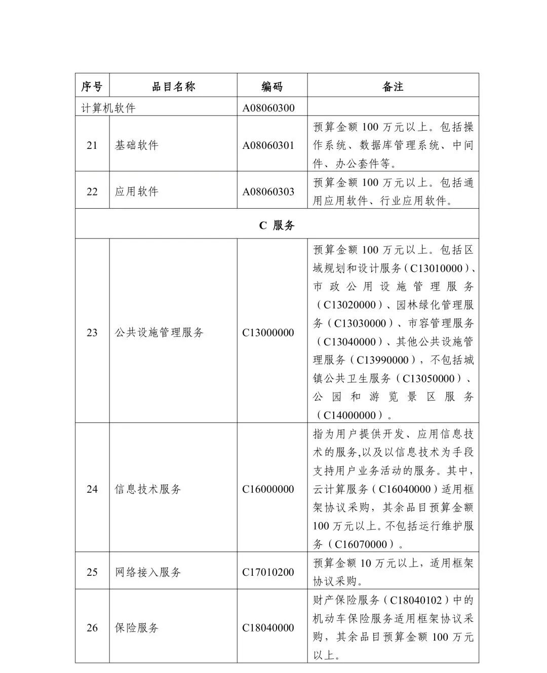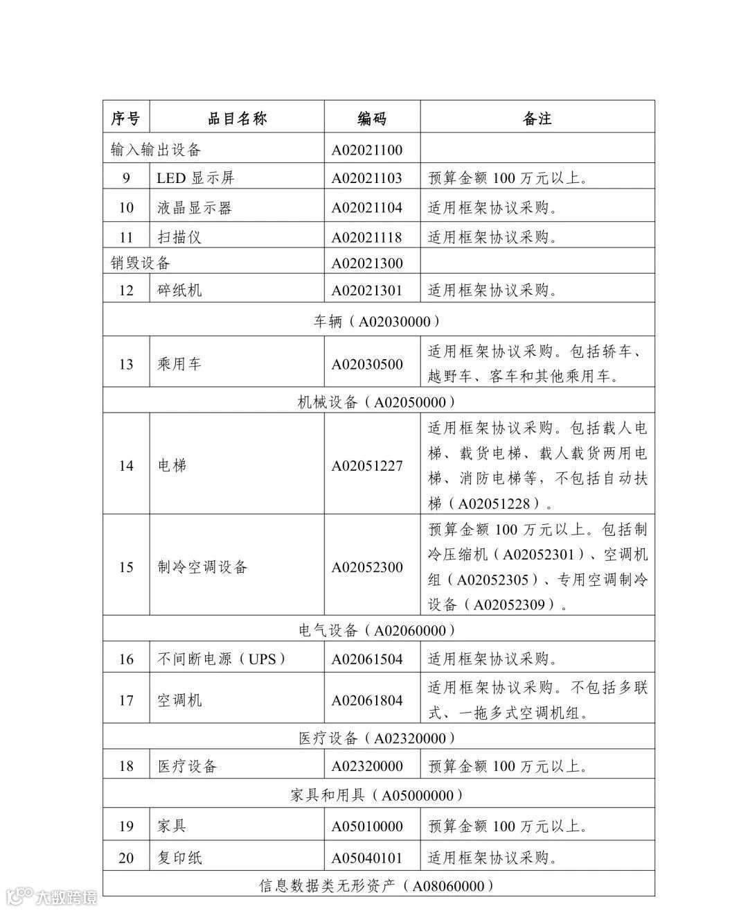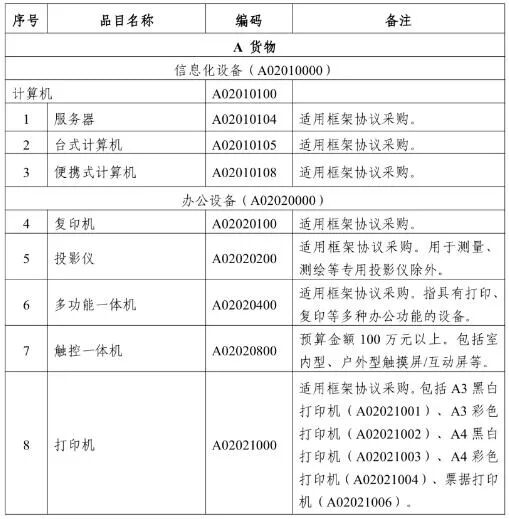 注:(1)集中采购目录的品目名称、编码及说明按照《政府采购品目分类目录》(财库〔2022〕31号)执行和解释。(2)表中注明“适用框架协议采购”的品目,仅限于单笔采购金额不超过100万元的小额零星采购项目;预算金额在100万元以上、不属于框架协议采购适用情形的项目,应委托集中采购机构依法组织项目采购。(3)表中所称“以上”均包含本数,下同。