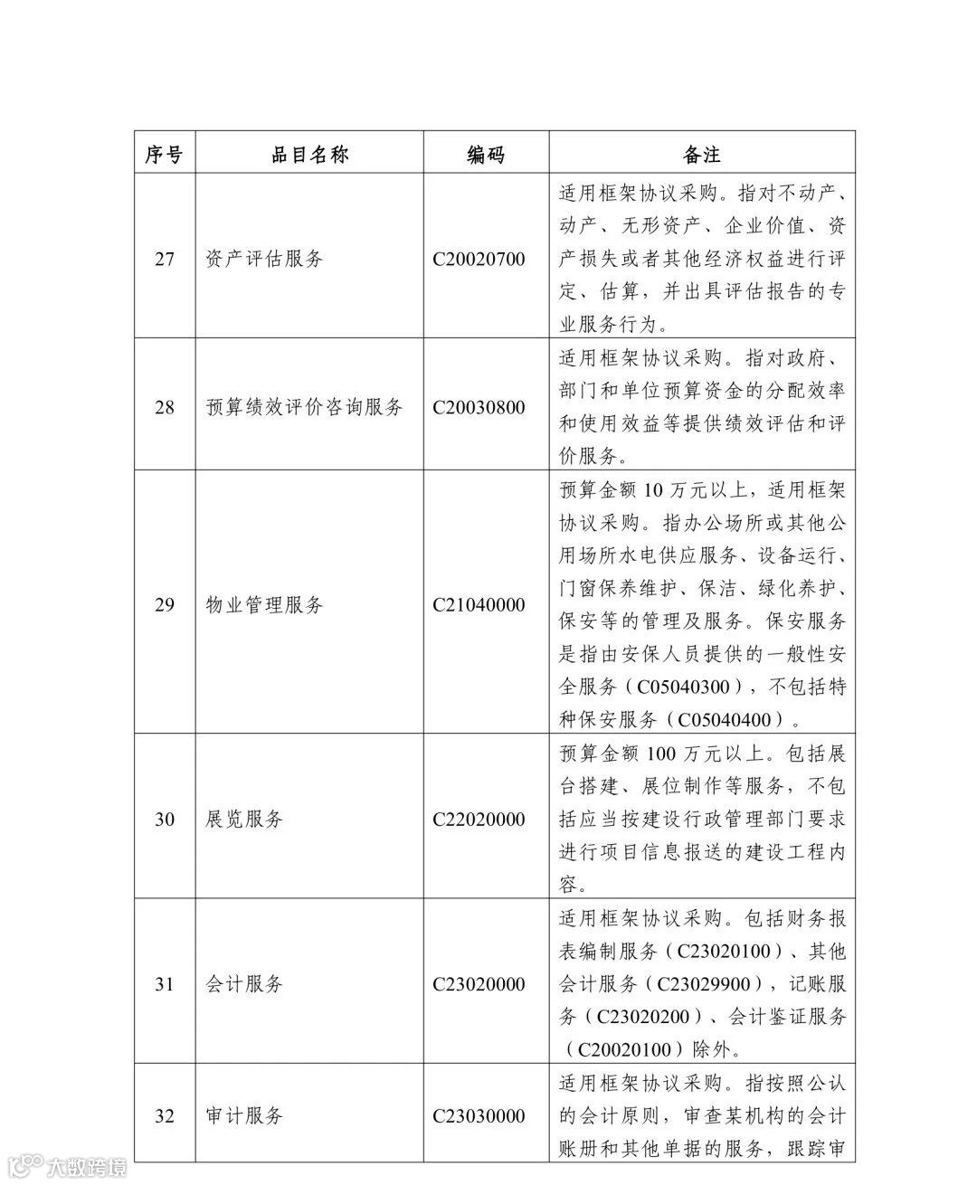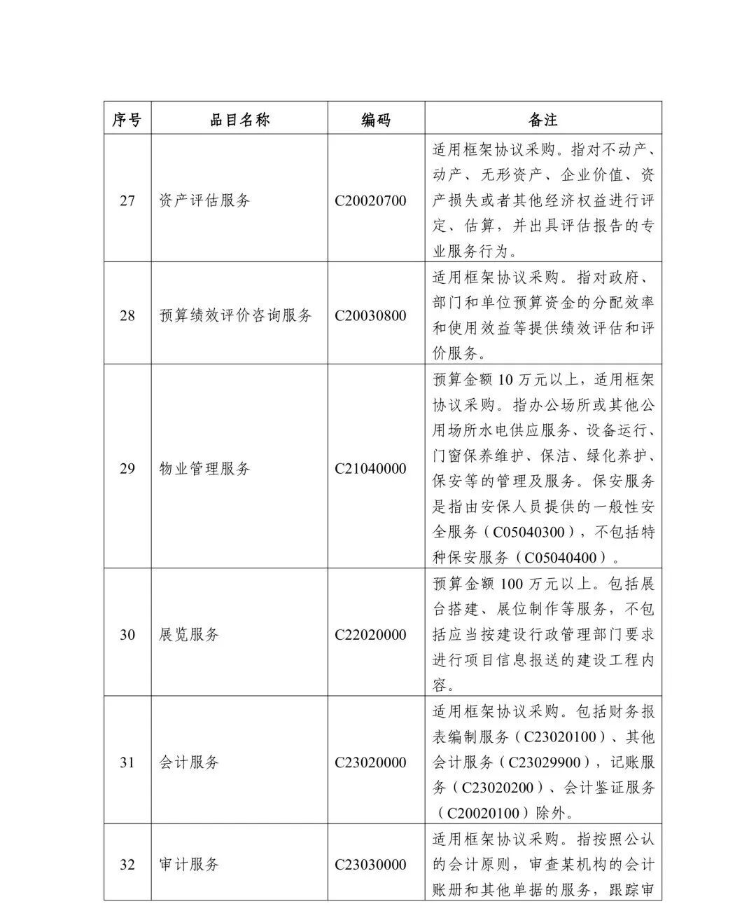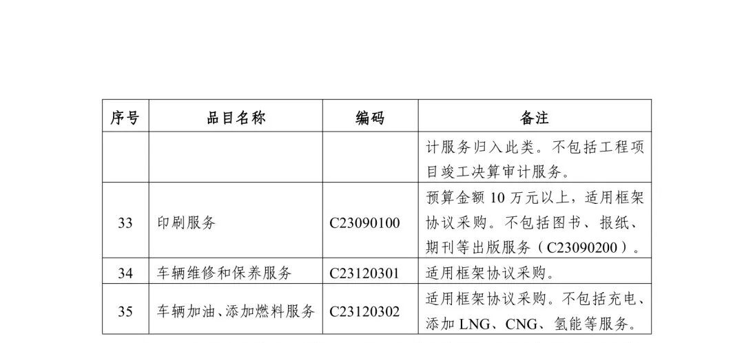 注:(1)集中采购目录的品目名称、编码及说明按照《政府采购品目分类目录》(财库〔2022〕31号)执行和解释。(2)表中注明“适用框架协议采购”的品目,仅限于单笔采购金额不超过100万元的小额零星采购项目;预算金额在100万元以上、不属于框架协议采购适用情形的项目,应委托集中采购机构依法组织项目采购。(3)表中所称“以上”均包含本数,下同。