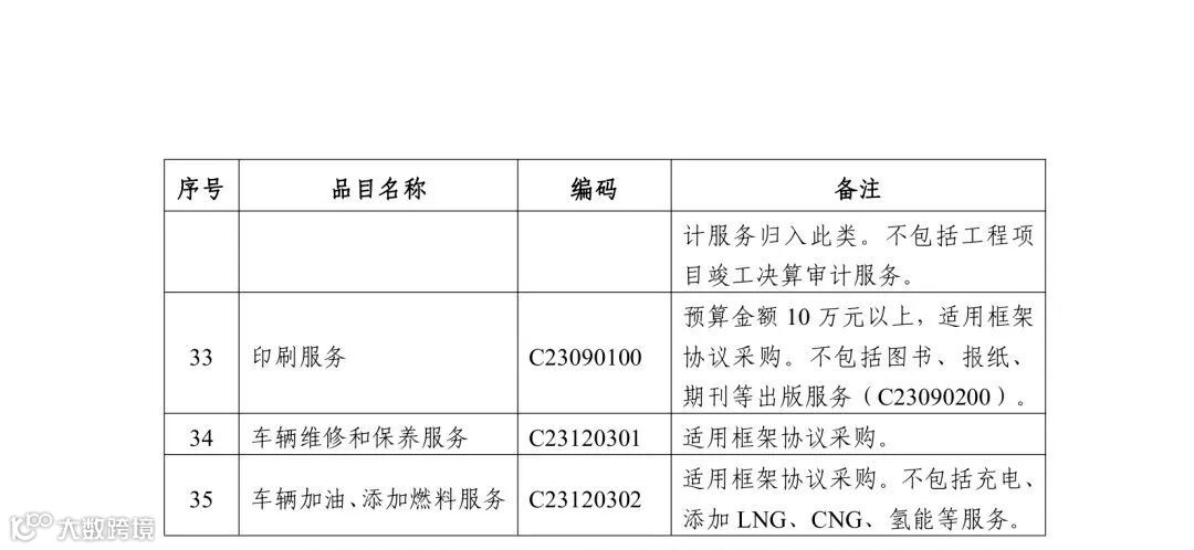 据了解,集中采购目录的品目名称、编码及说明按照《政府采购品目分类目录》(财库〔2022〕31号)执行和解释。2024目录及标准明确了35个品目,与上一版集采目录及标准相比减少了5个品目。其中车辆合并为1个品目为乘用车,适用框架协议采购。包括轿车、越野车、客车和其他乘用车;打印机由喷墨打印机、激光打印机、针式打印机合并为打印机1个品目,并且由输入输出设备——打印机归类为办公设备等。