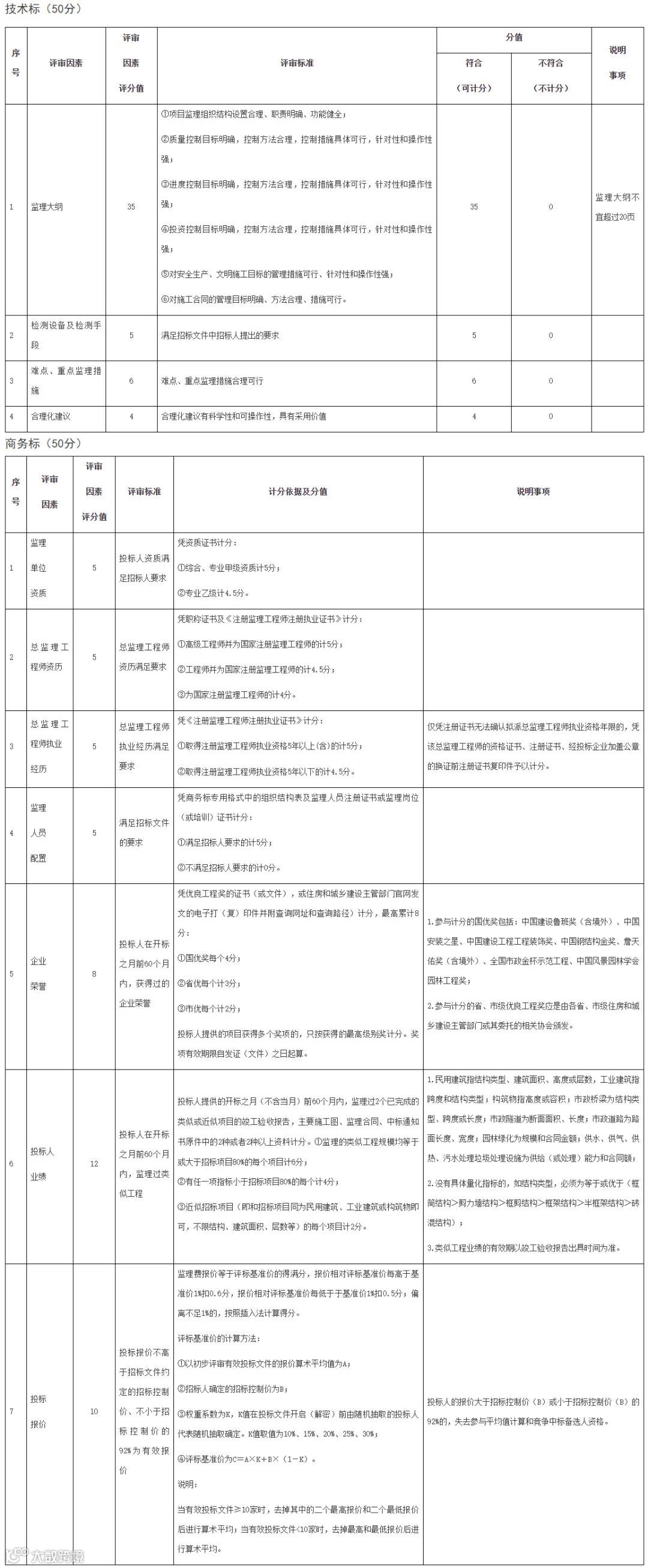 监理招标采用综合评估法评标,设定分值为100分,其中:技术标50分,商务标(综合素质、报价)50分。