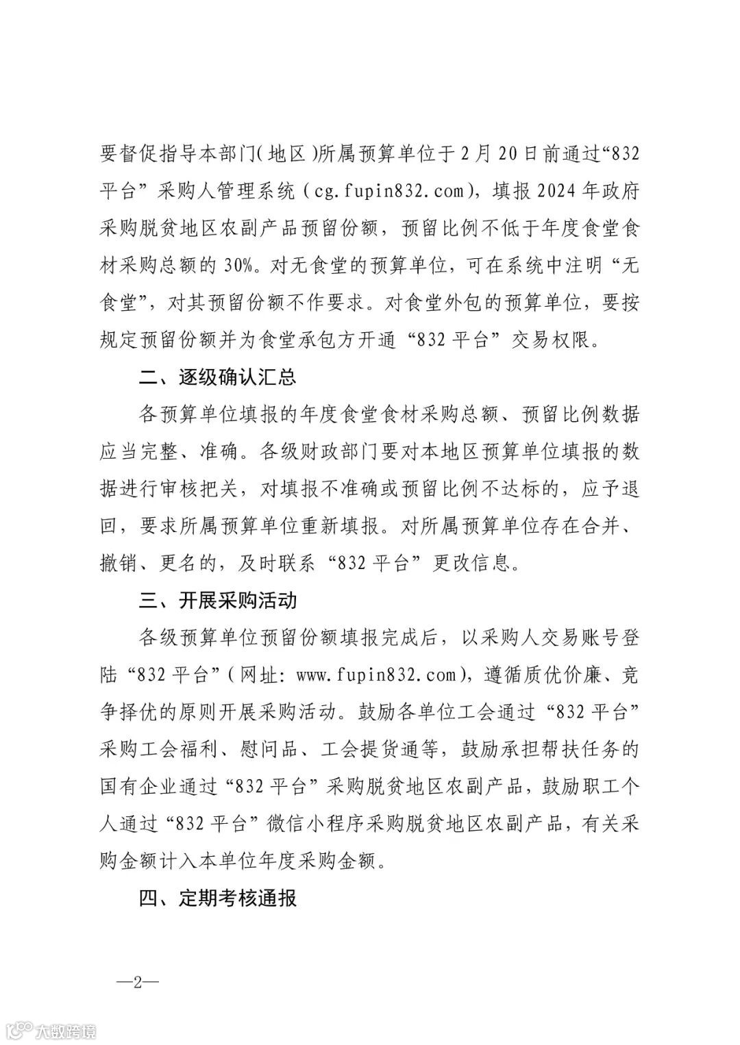 《通知》要求,进一步做好2024年政府采购脱贫地区农副产品工作,预留比例不低于年度食堂食材采购总额的30%。对无食堂的预算单位,可在系统中注明“无食堂”,对其预留份额不作要求。对食堂外包的预算单位,要按规定预留份额并为食堂承包方开通“832平台”交易权限。
