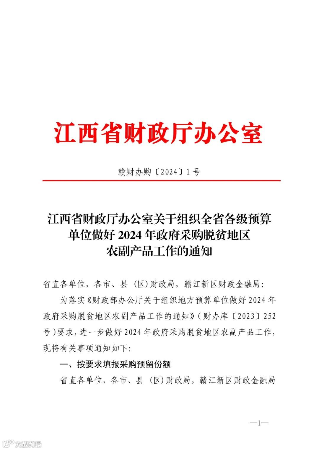日前,江西省财政厅办公室印发《关于组织全省各级预算单位做好2024年政府采购脱贫地区农副产品工作的通知》(赣财办购〔2024〕1号,以下简称《通知》)。