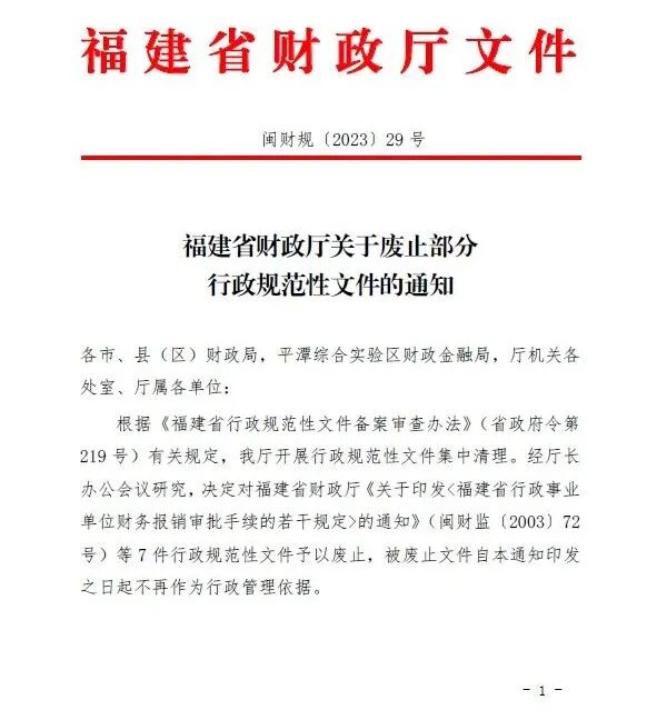 日前,福建省财政厅印发《关于废止部分行政规范性文件的通知》(以下简称《通知》)。