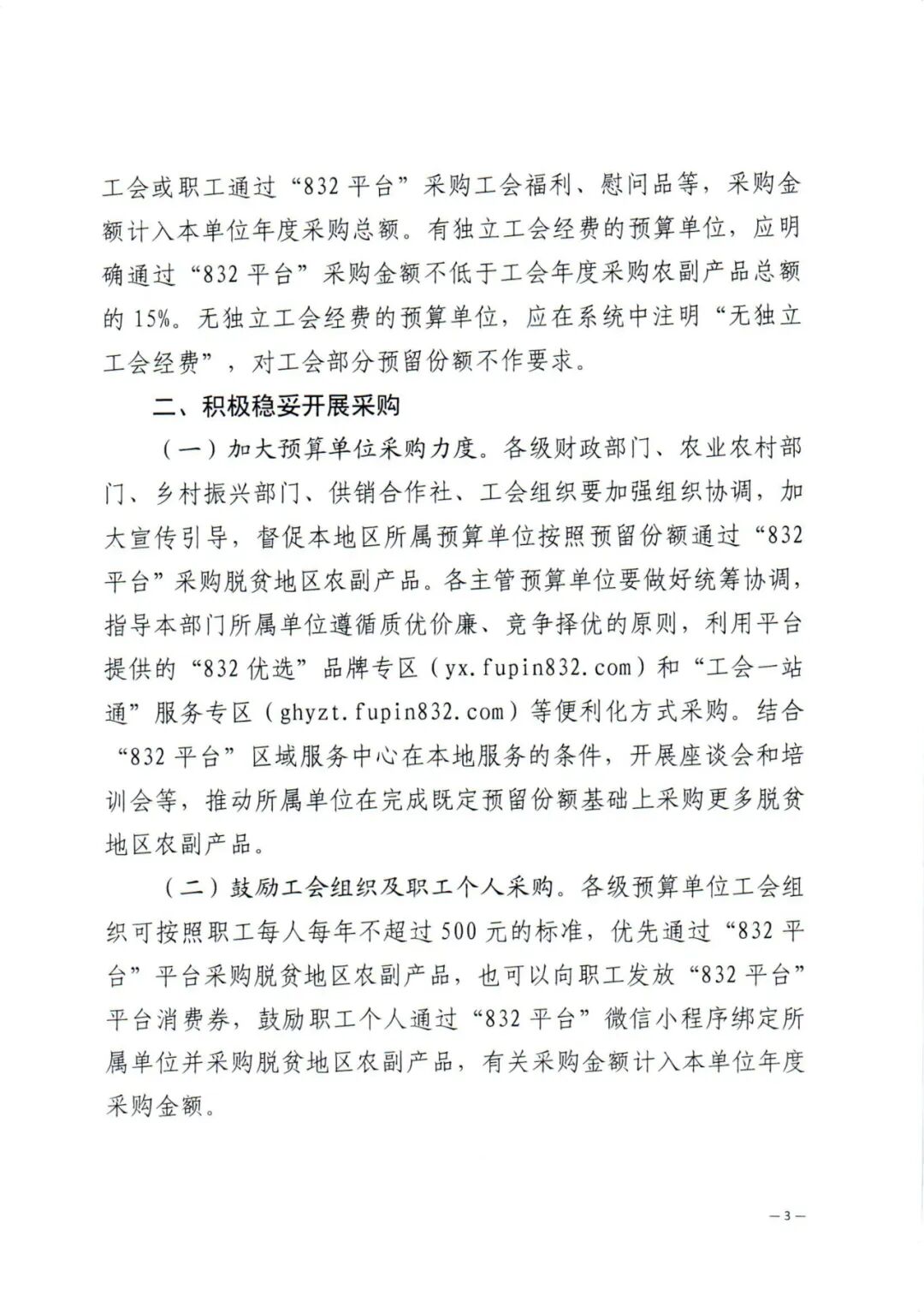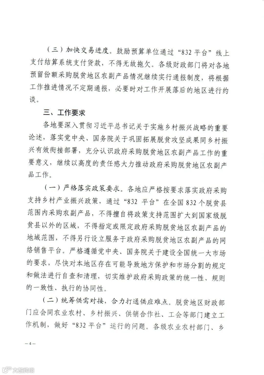 《通知》强调,各地应严格按要求落实政府采购支持乡村产业振兴政策,通过“832平台”在全国832个脱贫县范围内采购农副产品,不得擅自将政策支持范围扩大到国家级脱贫县以外的区域,不得指定或限定政府采购脱贫地区农副产品的地域范围,不得另行设立服务于政府采购脱贫地区农副产品的网络销售平台。工会要在采购脱贫地区农副产品工作中发挥积极作用,在工会活动中提高帮扶产品采购份额。