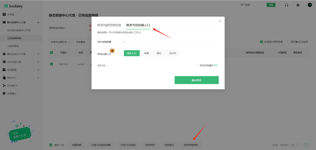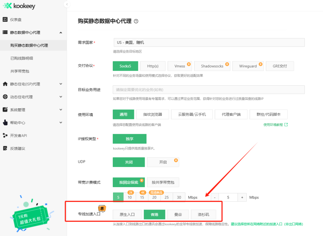 新购买用户可直接在静态数据中心代理选择线路时,在专线加速入口里选择,目前可选择的入口有香港、曼谷、洛杉矶。