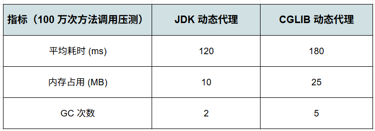 在JDK中,线程池的设计核心是“线程调度和连接复用”;而在CGLIB中,代理对象构建严重依赖类加载与缓存机制,高并发下性能差距明显。