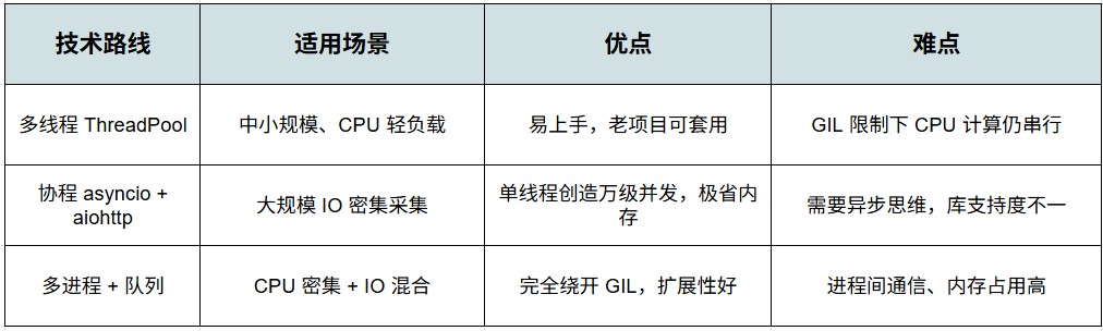 import asyncio, aiohttp, timesem = asyncio.Semaphore(100) # 限制并发上限为100async def fetch(session, url):async with sem:try:async with session.get(url, timeout=15) as r:return await r.text()except Exception as e:return f"Error: {e}"async def main(urls):async with aiohttp.ClientSession() as s:tasks = [fetch(s, u) for u in urls]return await asyncio.gather(*tasks, return_exceptions=True)start = time.time()urls = [f"https://example.com/page/{i}" for i in range(1, 1001)]results = asyncio.run(main(urls))print(f"{len(urls)} pages done in {time.time()-start:.1f}s")