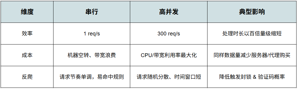 打个比方,同样是爬10万条数据,串行跑可能得花8小时以上;但如果并发数拉到500,即使网络条件不变,时间可能只要十几分钟。