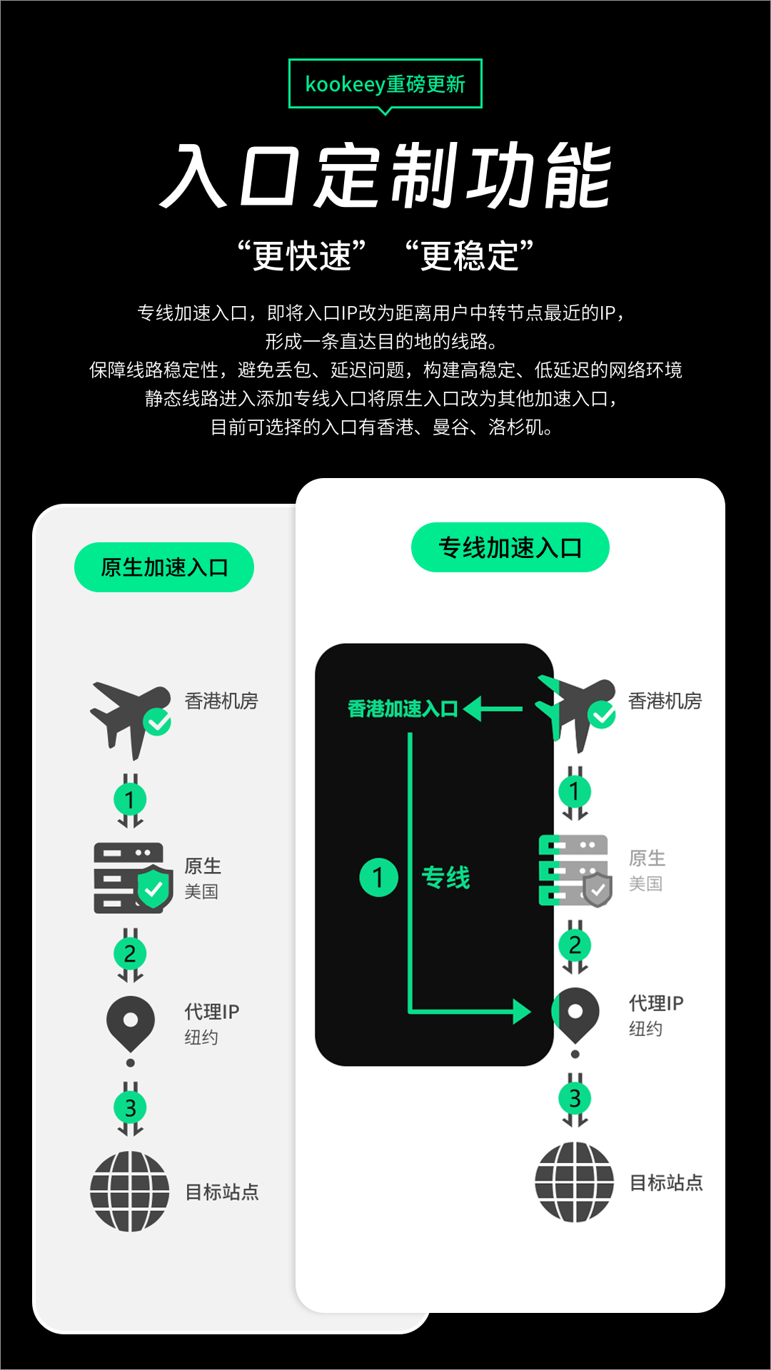 专线入口定制功能与出口目的地形成一条专线,“专线直达”构建高稳定、低延时的网络环境,详情戳>>重磅更新!kookeey全新功能:入口定制功能