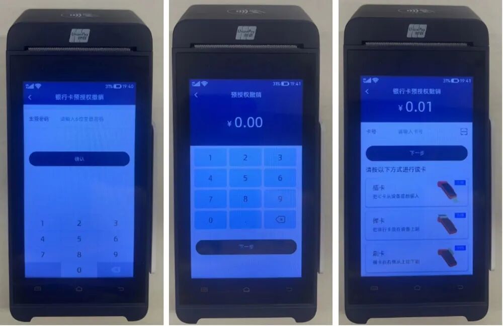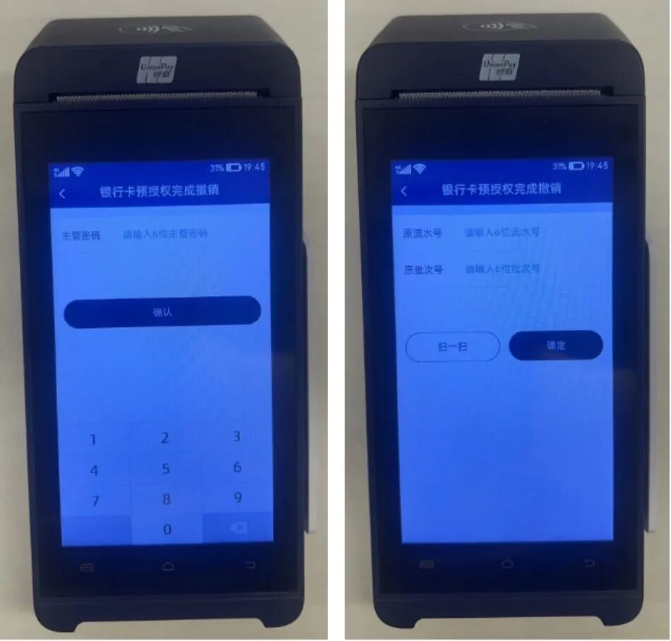 输入主管密码(默认为123456)→输入金额→手工输入卡号/刷卡进行下一步,或者扫码预授权单据的二维码进行预授权撤销