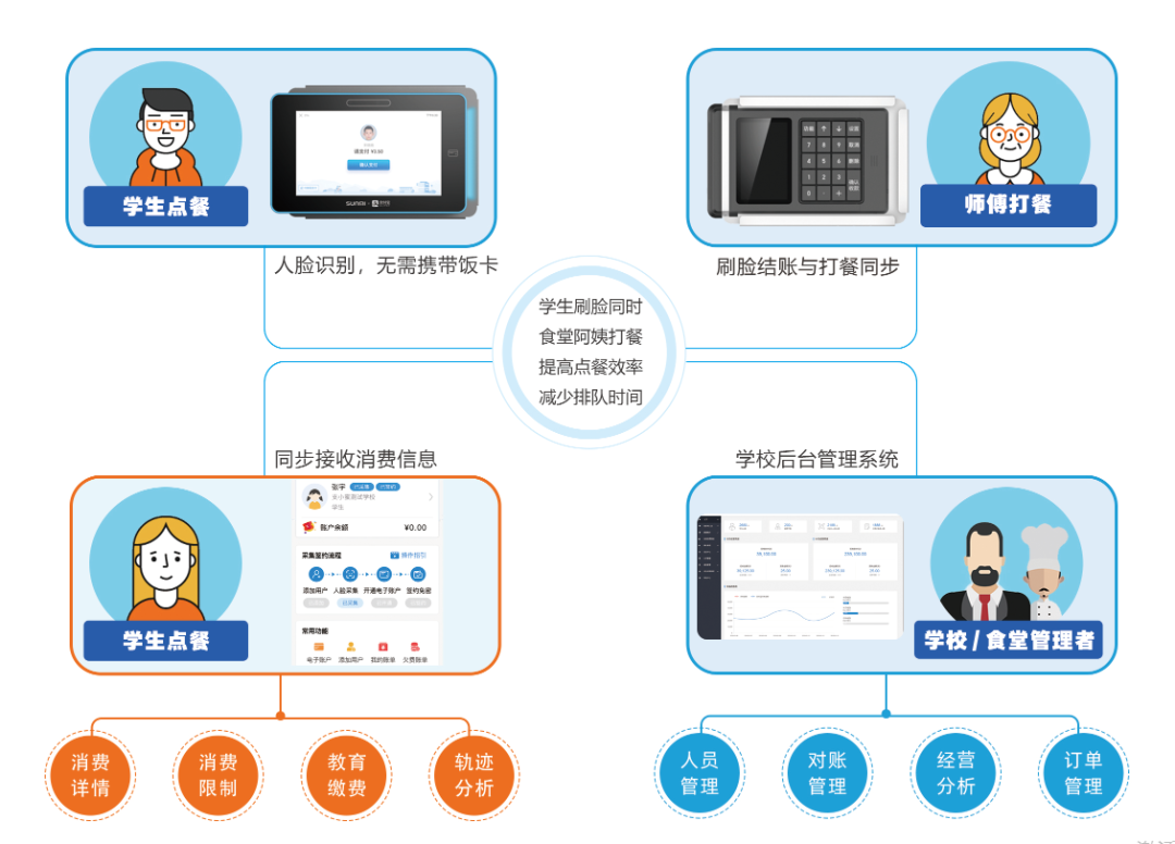 传统食堂点餐结算需要人工进行,流转慢、排队长;并且有录入错误风险;学生携带校园卡存在丢卡、忘卡、余额不足等烦恼;充值需要携带现金,存在现金丢失等不安全因素。