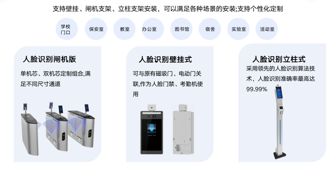 利用人脸识别、红外测温技术部署人脸识别体温筛查智能终端设备实现对校园进出人员入校、在校、离校全流程一体化安全防护管理,全面覆盖师生考勤、签到、宿舍、图书馆、食堂等管理系统,降低管理成本,提高校园整体安防水平。