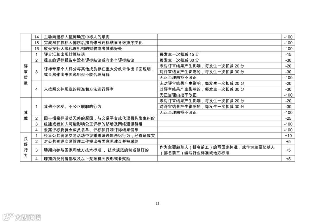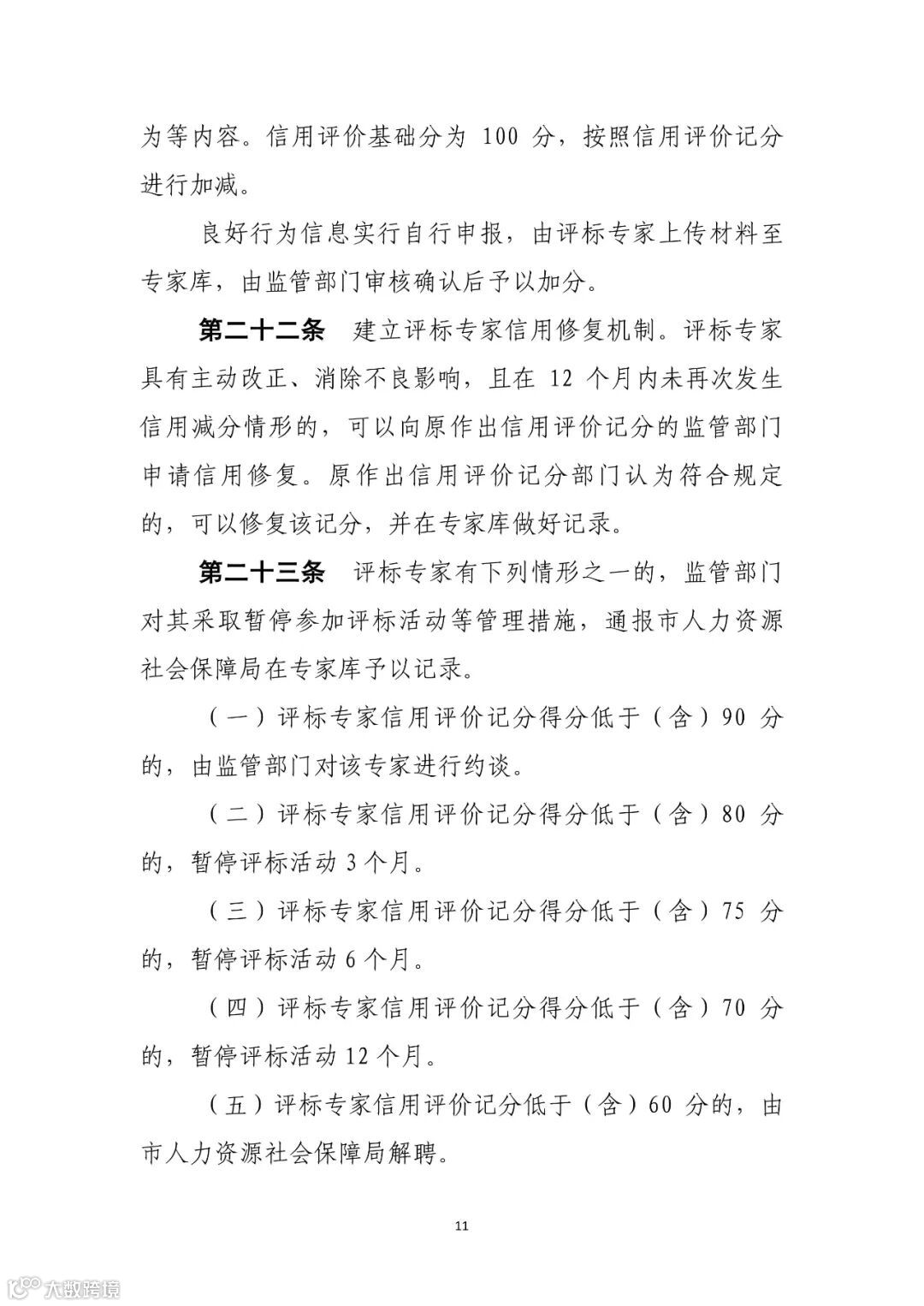 对于信用评价方面,《征求意见》提出,对评标专家信用评价进行记分,包括基础信息、交易场所纪律、评审纪律、评审质量、公正履职和良好行为等内容。信用评价基础分为100分,按照信用评价记分进行加减。评标专家信用评价记分得分低于(含)90分的,由监管部门对该专家进行约谈;低于(含)80分的,暂停评标活动3个月;低于(含)75分的,暂停评标活动6个月;低于(含)70分的,暂停评标活动12个月;低于(含)60分的,解聘。