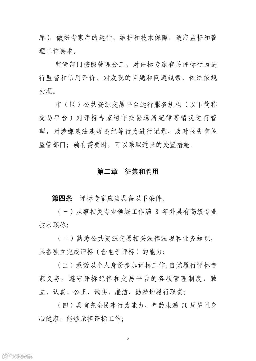 《征求意见》规定,评标专家需从事相关专业领域工作满8年并具有高级专业技术职称;熟悉公共资源交易相关法律法规和业务知识,具备独立完成评标(含电子评标)的能力。评标专家实行聘用制,聘期为1到3年。聘期届满依然符合聘用条件的可提交续聘申请。评标专家聘期内年龄达到70周岁时,自动解聘。