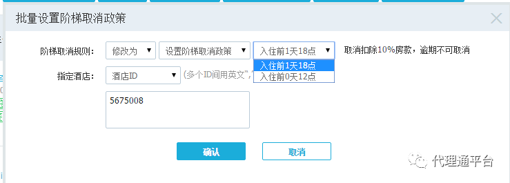2)目前阶梯取消规则可设:入住前1天18点 或 入住前0天12点取消扣除10%房款,逾期不可取消。酒店报名阶梯取消政策即该酒店下所有房型参与阶梯取消政策