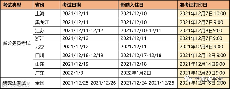 代理通平台2021年12月,全国将有8个省份将开展省公务员考试及研究生考试。为了预控考试入住订单服务质量,根据以往历届考试相关数据分析,打印准考证时间开始后,将有大量进单,建议供应商做好预控: