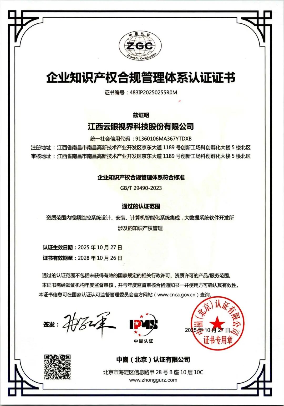近日,江西云眼视界科技股份有限公司正式获得企业知识产权合规管理体系认证证书,认证标准符合GB/T 29490-2023,认证范围涵盖资质范围内视频监控系统设计、安装、计算机智能化系统集成,大数据系统软件开发涉及的知识产权管理。