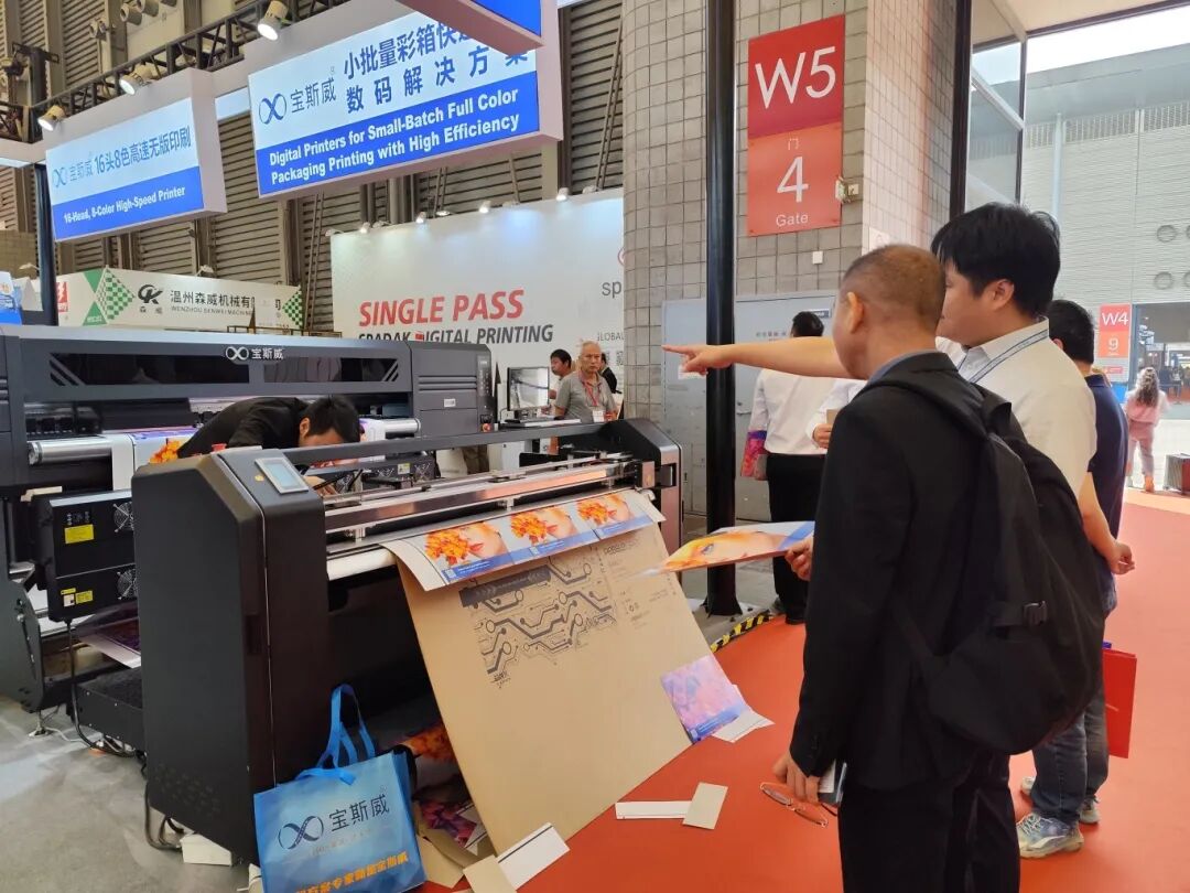 设备最大支持1.8米幅宽纸张的数码彩印,弥补了胶印在大尺寸彩箱制作方面的局限。现场打样区,吸引了众多客户围观。他们对设备输出的精度与稳定性给予了肯定。