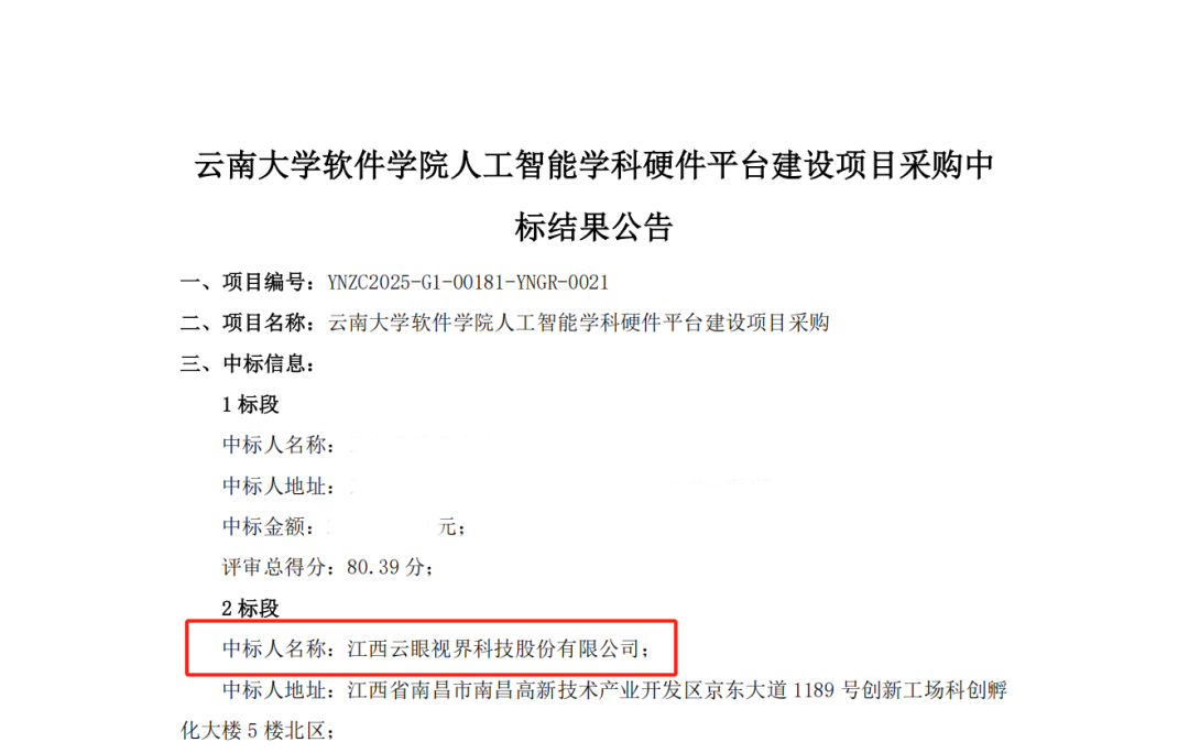 近日,江西云眼视界科技股份有限公司成功中标2025年云南大学软件学院人工智能学科硬件平台建设项目采购。