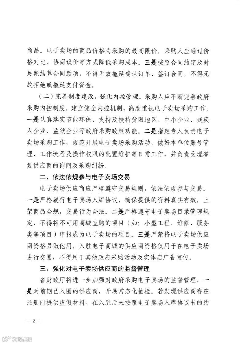 《通知》还要求,强化对电子卖场供应商的监督管理,省财政厅将进一步加强对政府采购电子卖场的监督管理。对前期已入围的供应商,开展常态化抽检。若发现供应商存在注册时提供虚假材料、在入驻后未按照电子卖场入库协议书的约定期限及时上架产品、1个自然年内交易额为零等情形,将取消其入围资格。