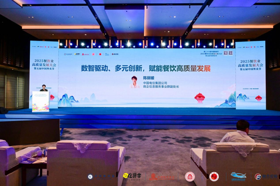 会上,中国电信集团政企信息服务事业群销售拓展部副处长陈丽媛发表主旨演讲。她指出,当前餐饮消费进入平稳增长期,食品安全升级与业态融合、社区渗透、餐饮出海、AI应用等差异化创新成为行业趋势。