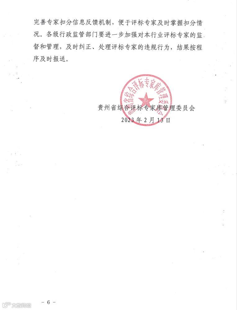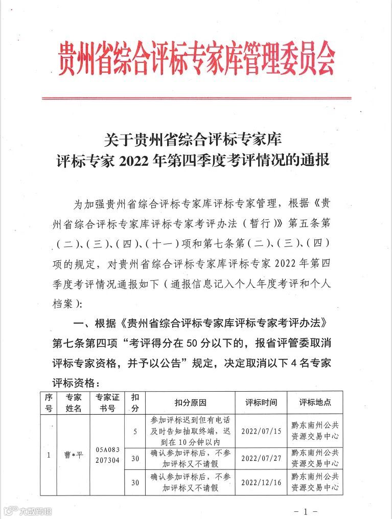 日前,贵州省综合评标专家库发布发布《关于2022年度第四季度省综合评标专家库评标专家考评情况的通报》。