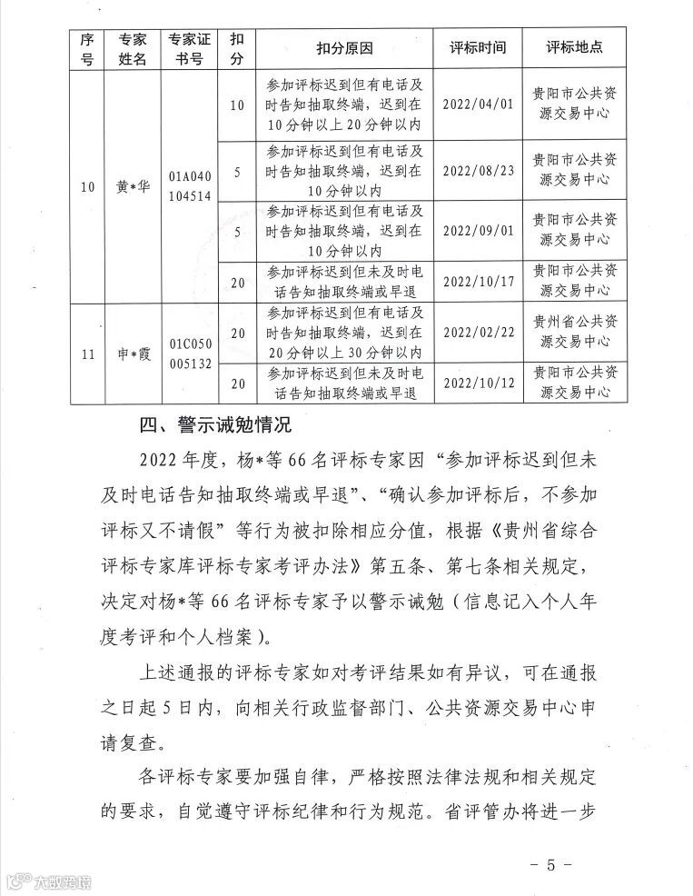 警示诫勉明确,2022年度,杨*等66名评标专家因“参加评标迟到但未及时电话告知抽取终端或早退”“确认参加评标后,不参加评标又不请假”等行为被扣除相应分值,决定对杨*等66名评标专家予以警示诚勉(信息记入个人年度考评和个人档案)。