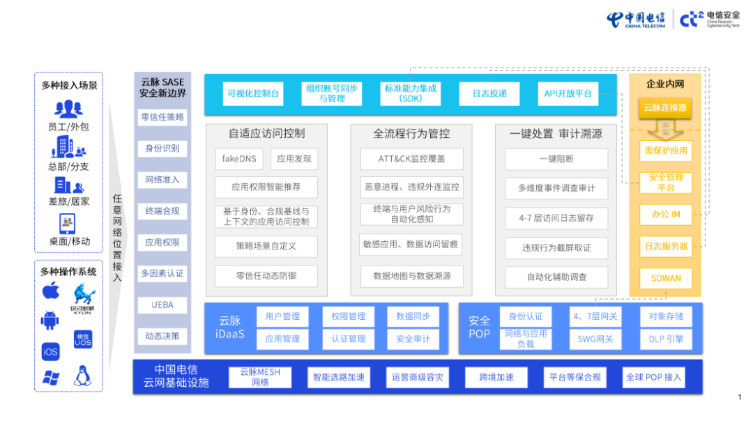 云脉SASE是融合了中国电信全球优质网络与中国电信安全公司核心安全能力的新型办公安全服务平台,能够为用户提供零信任网络接入、数据外发管控、终端安全、IT 效能管理一体化能力,以云原生架构让安全内置企业业务,实现企业办公安全和数据安全的协同管理。同时,产品利用自然语言处理、用户异常行为分析和机器学习算法等人工智能技术,解决企业数字化办公IT架构下的安全治理难题以及AI浪潮下办公场景新型态数据泄漏威胁。