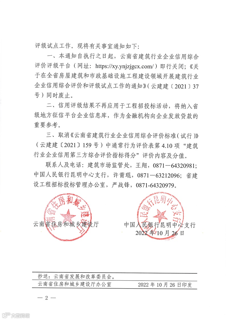 日前,云南省住建厅印发《关于结束全省房屋建筑和市政基础设施工程建设领域建筑行业企业信用综合评价评级试点工作的通知》(以下简称《通知》)。