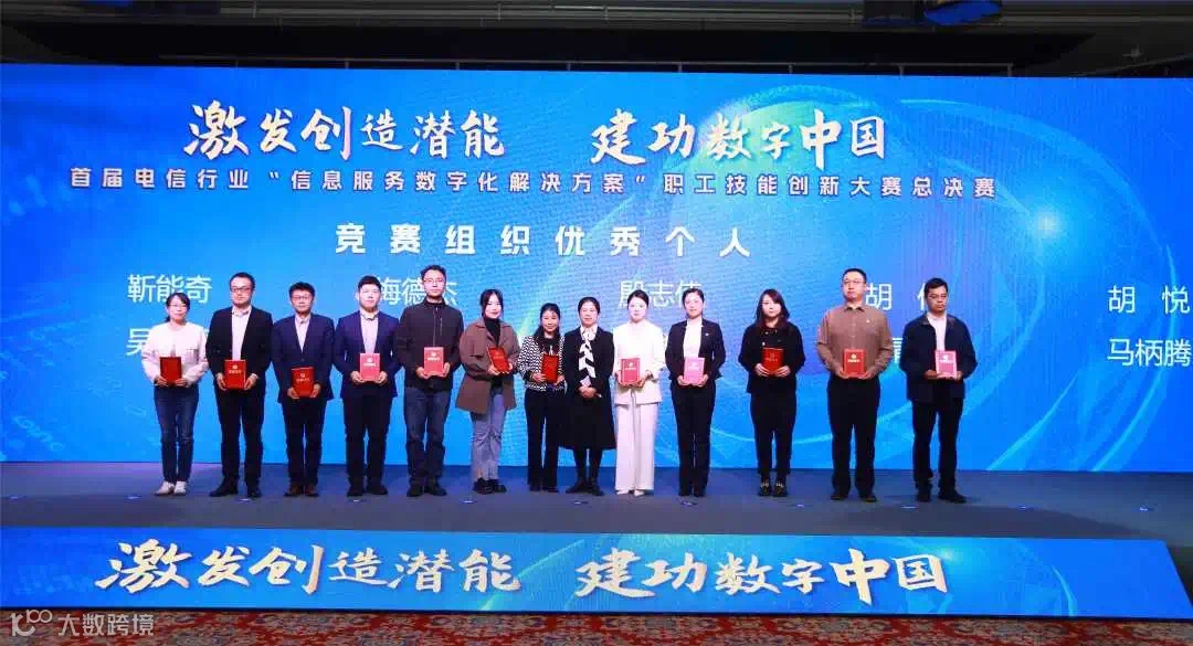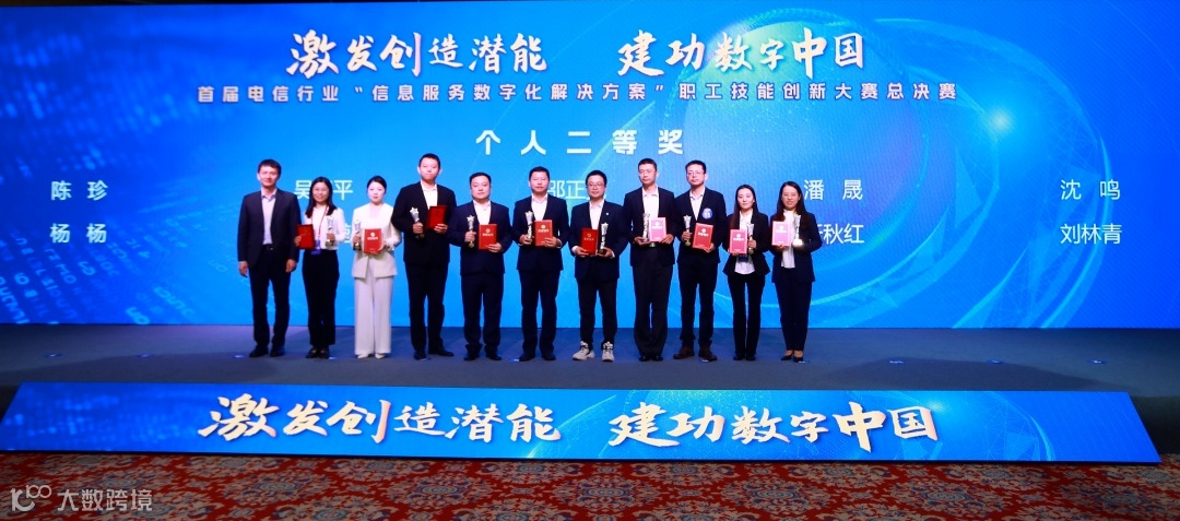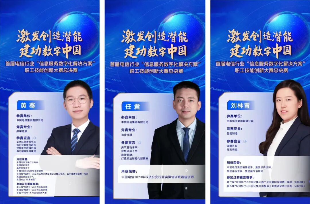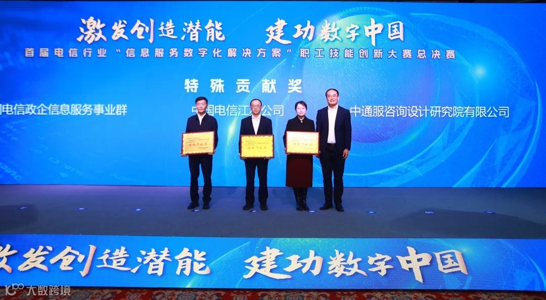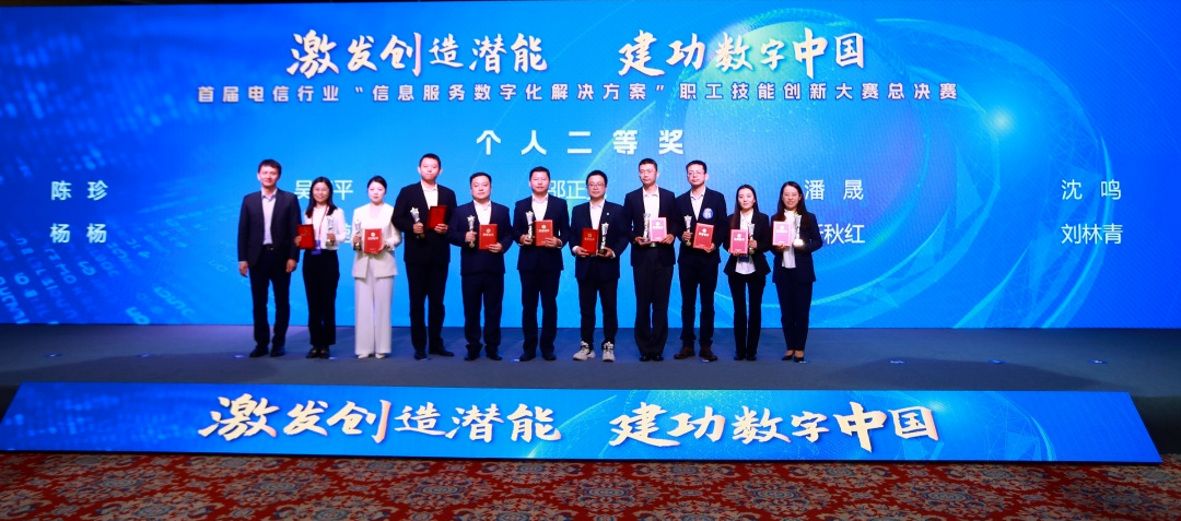 经过理论考试、限时制作方案、现场讲解呈现等环节的激烈角逐,中国电信荣获最佳战绩:决赛派出6名选手,斩获5个一等奖中的3个,摘得3个二等奖,包揽个人总分第一名、第二名!黄骞、刘炜、应黎航获得个人一等奖,沈鸣、任君、刘林青获得个人二等奖,中国电信团体获得优秀组织奖,政企信息服务事业群获得特殊贡献奖。