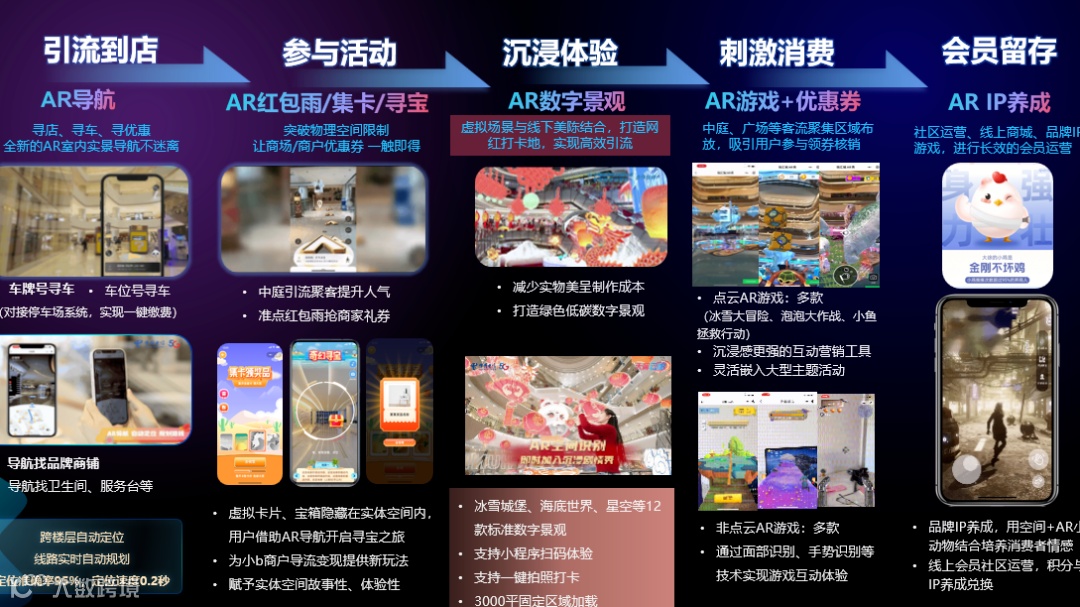 将AI、VR和AR技术与商场内业务场景深度融合应用,利用大数据、云计算等技术不断对商场的运营、管理、安全、商业等核心应用不断赋能。
