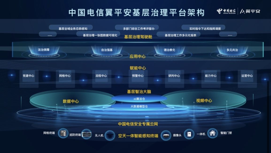 中国电信翼平安基层治理平台基于中国电信安全专属云网基础设施,融合对接各类感知及应用终端,构建数据中心、视频中心和智治大脑,为不同场景的基层治理应用实现科技赋能。数据中心通过多元异构的数据清洗,把政府数据、社会数据、静态数据、动态数据进行融合,为智治大脑提供数据专题应用;视频中心通过多维感知的视频汇聚,推动低成本的AI落地,为智治大脑提供各类技战法和结果。基于数据的融合和业务的协同,智治大脑可以帮助客户构建人、地、事、物、组织、网络的全域立体化信息智能平台,服务于整个基层治理的感知、发现、预警、研判、决策等各个重要环节,全面提升基层社会治理效能。
