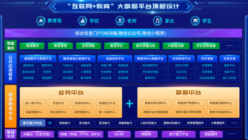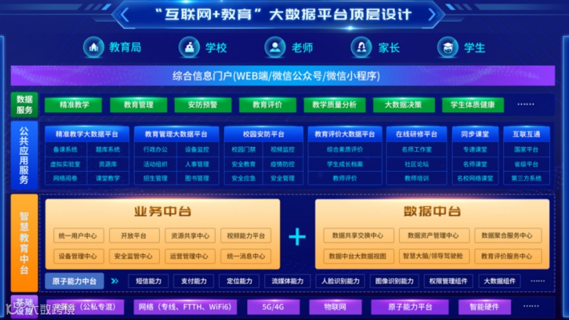 互联网+教育大数据平台依据《教育信息化2.0行动计划》,面向教育厅/局提供的一站式局校一体化平台,基于智慧教育双中台,整合应用,融通数据,面向教育管理者、教师、学生提供精准教学、教育管理、校园安防、教师研修、教育评价、同步课堂等8大核心应用服务,解决教育发展不均衡、数据孤岛、优质资源汇聚难等问题,助力教育服务供给模式升级和教育治理水平提升。