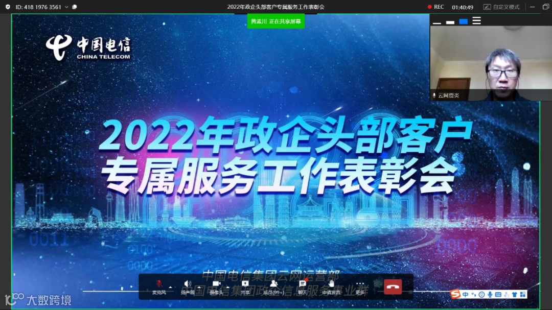 为深入贯彻落实集团公司云改数转战略及工作会的要求,以高质量服务推动高质量发展,进一步提升重要政企客户专属服务能力,2022年12月16日上午,集团云网运营部、政企信息服务事业群组织 “2022年政企头部客户专属服务表彰暨交流会”,本次会议邀请了交通银行和美的集团等客户出席,集团政企信息服务事业群、集团云网运营部及31省公司政企信息服务事业群及云网运营部相关领导同事参加。