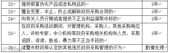 案例一:某采购文件中,投标人在采购活动中出现下列违规行为的将记入该市农业农村局的采购不良行为记录,并在记录时限内暂停其在该市农业农村局政府采购交易资格,同时不良行为在该市公共资源交易中心网站公示。以下行为5年不可参加政府采购(如下图)