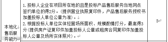 案例五:采购文件要求本地化售后服务能力。根据投标人单位实体经营场所面积、规模酌情打分,最高得3分(提供房产证复印件加盖投标人公章或租房合同复印件加盖投标人公章及场所实体照片)。(如下图)