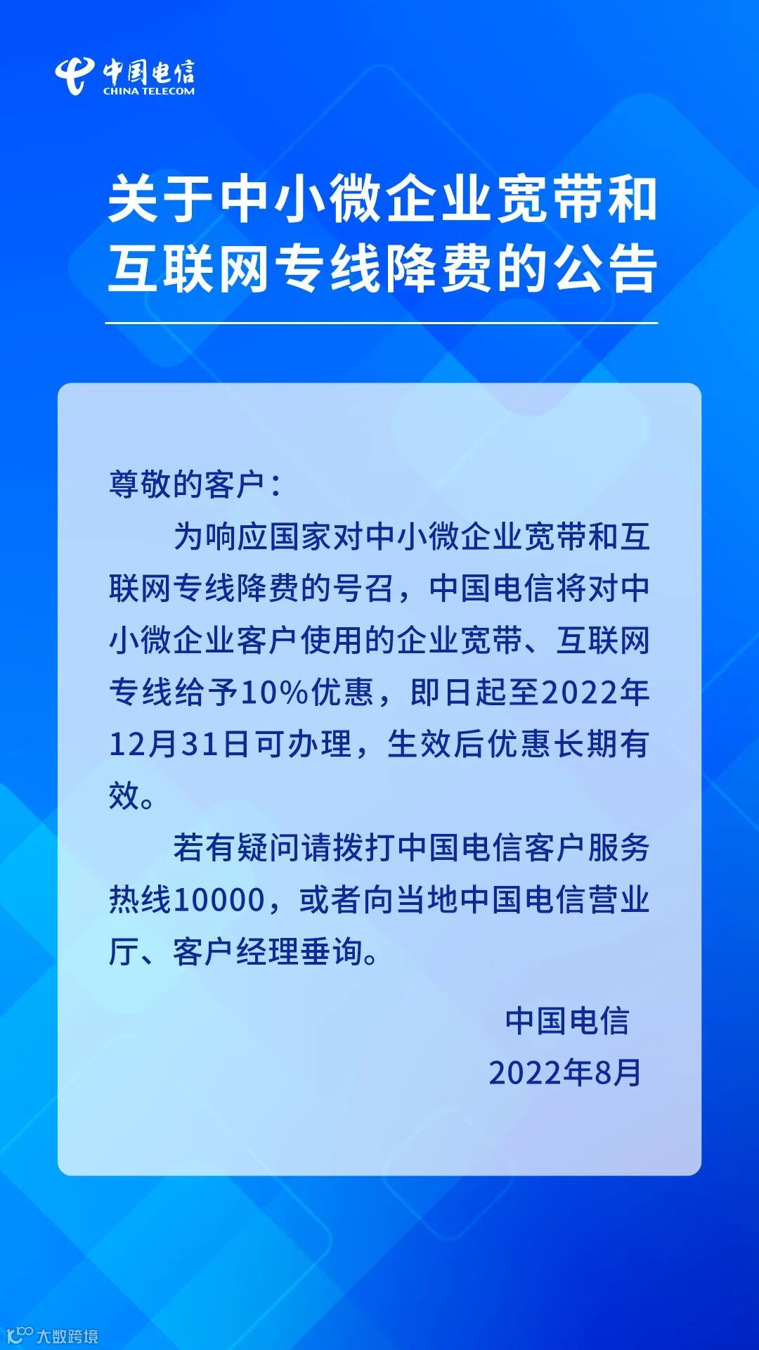 【关于中小微企业宽带和互联网专线降费的公告】为响应国家对中小微企业宽带和互联网专线降费的号召,中国电信将对中小微企业客户使用的企业宽带、互联网专线给予10%优惠,即日起至2022年12月31日可办理,生效后优惠长期有效。若有疑问请拨打中国电信客户服务热线10000,或者向当地中国电信营业厅、客户经理垂询。