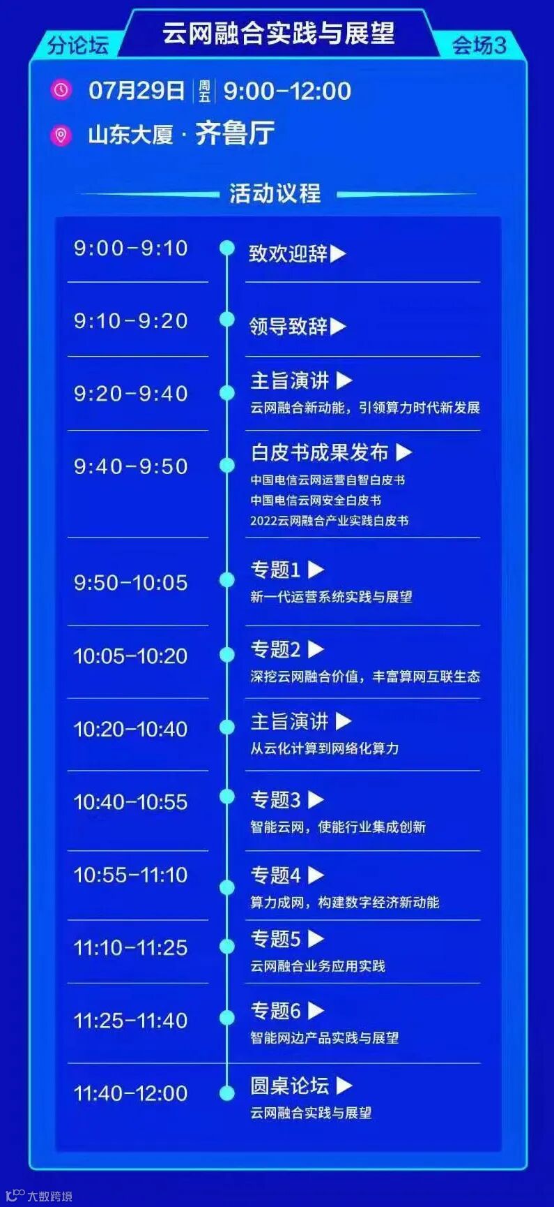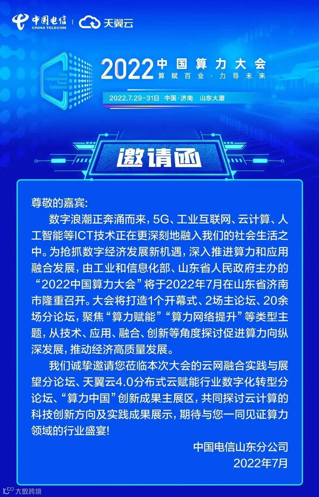 由工业和信息化部与山东省人民政府共同主办的2022中国算力大会将于7月29至31日在山东省济南市召开。本届大会以“算赋百业,力导未来”为主题,设置两大主论坛、一场成果发布会、27场分论坛以及“算力成果”成果展,将重磅发布我国首个综合算力指数、首部《算力白皮书》、首个《算力设施产业图谱》等系列成果,还将签约一系列国家级、省级算力合作项目。