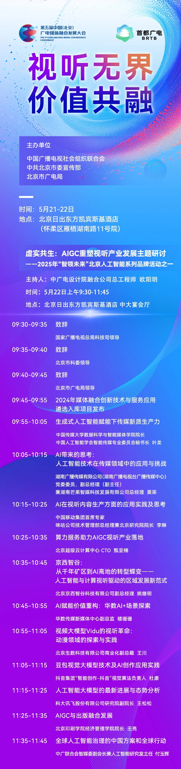 5月21日-22日,第五届中国(北京)广电媒体融合发展大会即将在京启幕!本届大会采用"5+N"模式,精心打造16场主题论坛及配套活动,汇聚行业顶尖智慧,共绘视听融合新图景。