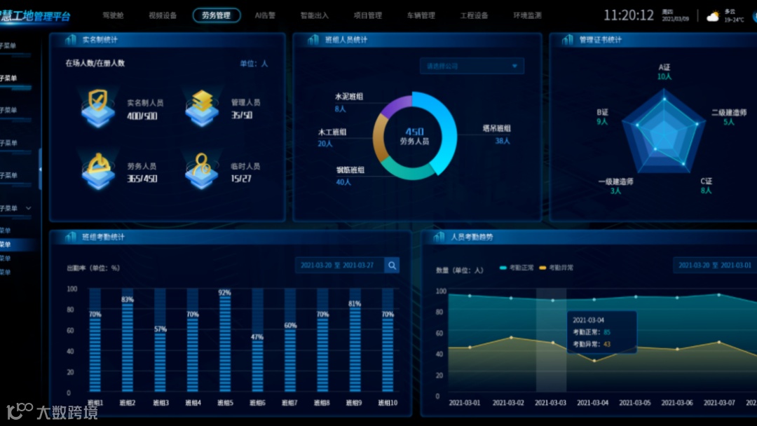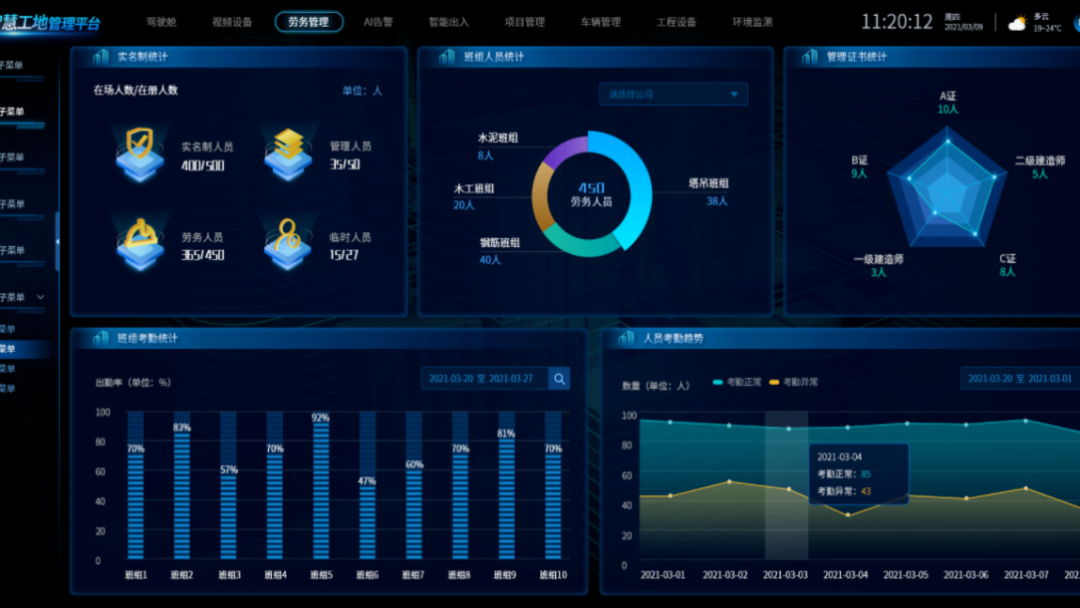 智慧工地管理平台集成所有劳务班组信息,用一张图,一张表,把劳务人员分布情况直观展示给工地决策人员。人员总览信息包括“劳务人员班组信息”、“劳务人员进场情况”、“劳务人员出勤情况”等。