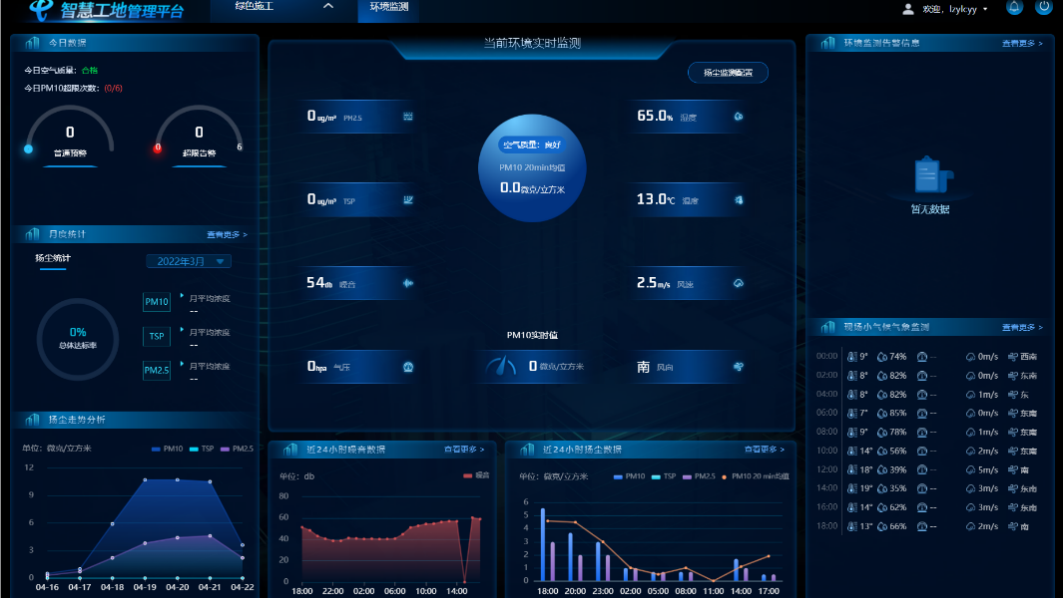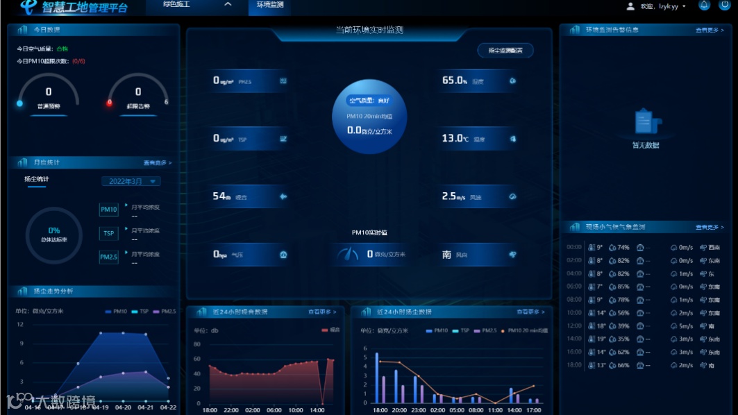 在施工进行的同时,环境监测系统还在以每分钟一条的频率,实时将数据上报至智慧工地管理平台。主要监测指标包括:PM2.5、PM10、TSP、噪声、温度、湿度、风向、风速、气压等参数。根据监测结果展示环境指数整体达标率(噪音达标、扬尘达标),形成动态分布情况饼图,更直观的分析施工现场月度污染情况图,进一步落实绿色施工。