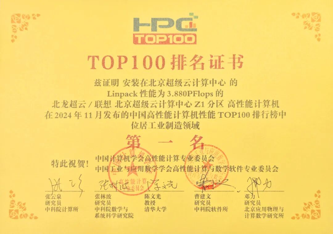 值得一提的是,北京超算Z1分区高性能计算机凭借Linpack性能为3.880PFLOPS的优秀表现,在“2024年中国高性能计算机性能HPC TOP100排行榜”中夺得工业制造领域第一名。这是北京超算首次获得该项荣誉。智能制造领域作为北京超算重点布局的服务领域,已实现诸多经典案例及解决方案。