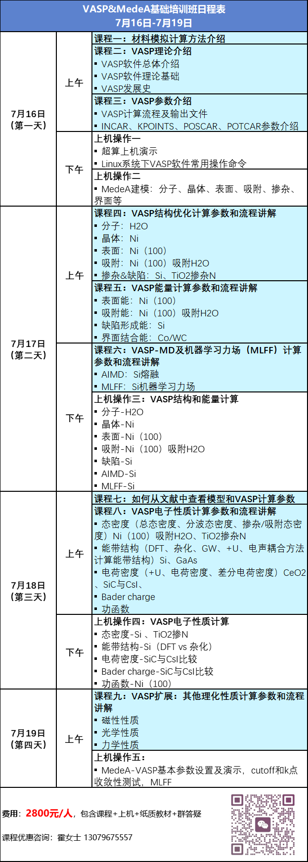 2024年7月16日-19日,特别推出“VASP&MedeA基础培训班”,3.5天线上培训,由北京超级云计算中心提供算力支撑,专业讲师团队精心打造,小班化教学,微信群专人答疑,欢迎大家踊跃报名!(点击此处,查看详情)